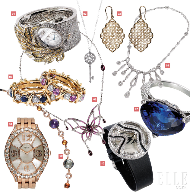 1 브레게 플륌므 컬렉션 와치 618,000,000원 화이트·옐로 다이아몬드 소재. 2 티파니 키 펜던트 11,000,000원대 플래티넘·다이아몬드 소재. 3 티파니 마라케쉬 이어링 2,000,000원대 옐로 골드 소재. 4 쇼메 조세핀 네크리스 가격 미정 화이트 골드·다이아몬드 소재. 5 티파니 잔 슐럼버제 식스 스톤 링 10,000,000원대 (아래) 사파이어·다이아몬드·옐로 골드 소재. (위) 핑크 사파이어 소재. 6 피아제 라임라이트 파라다이스 네크리스 가격 미정 화이트 골드·루비 소재. 7 쇼파드 링 200,000,000원대 사파이어 다이아몬드 소재. 8 쇼파드 와치 100,000,000원대 로즈 골드·다이아몬드 소재. 9 불가리 파렌티지 컬렉션 브레이슬릿 19,000,000원대 핑크 골드·다이아몬드·그린 쿼츠·애머시스트·시트린 소재. 10 까르띠에 롱 드 팡테지스트 와치 87,000,000원대 화이트 골드· 다이아몬드 소재. |