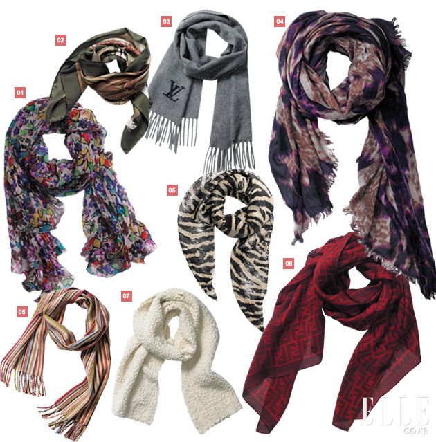 3 루이 비통 700,000원대 울 소재. 4 멀버리 398,000원 레이온 소재. 5 폴 스미스 210,000원 울·캐시미어 소재. 6 블루마린 가격 미정 스팽글 소재. 8 펜디 338,000원 실크 소재. 7 캘빈 클라인 컬렉션 570,000원 울 소재. |