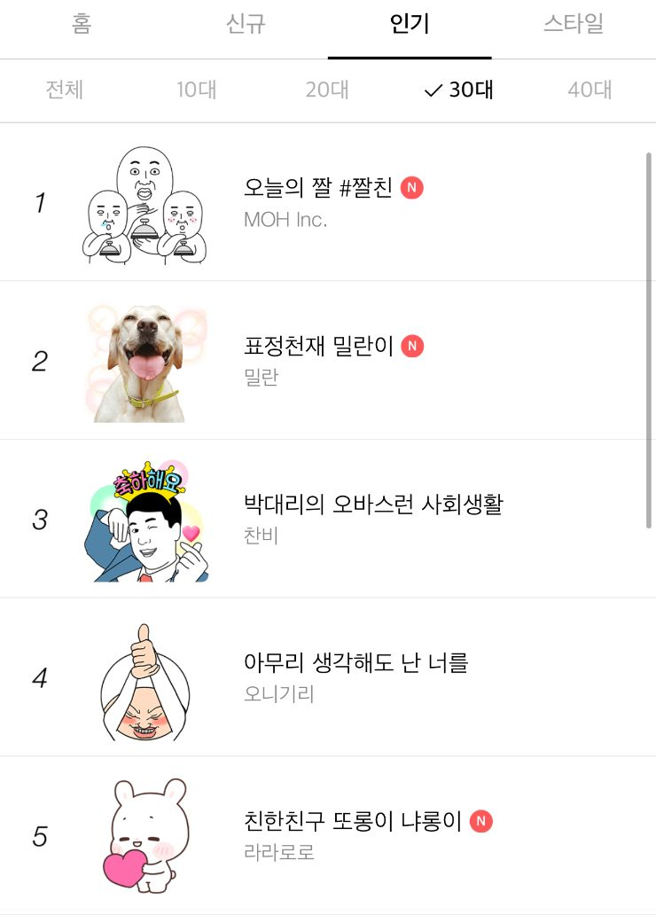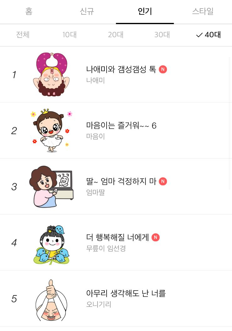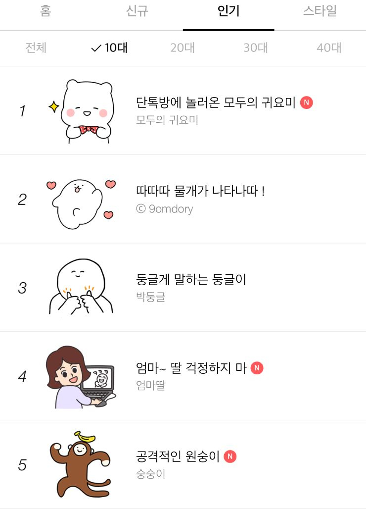 2위를 차지한 '따따따 물개가 나타나따!' 캐릭터는 물개예요. 역시나 선으로 캐릭터를 최대한 단순하게 표현하고, 귀엽고 애교 넘치는 디테일을 더한 게 눈에 들어오죠? 4위를 차지한 '엄마~ 딸 걱정하지 마'는 엄마와 딸이 함께 쓰는 이모티콘으로 동반 인기 상승 중이랍니다. 미세먼지를 대비한 '엄마 마스크'나 뉴스 앵커 톤의 '속보! 엄마 아직도 화 안 풀려' 등등. 엄마와의 '웃프고' 짠한 상황에서 사용하기 적절한 이모티콘으로 인기를 끌고 있네요!