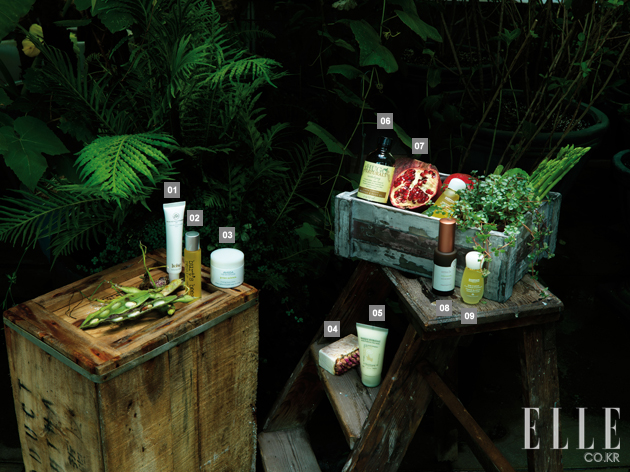 1 피부를 유연한 상태로 가꿔주는 이로와지 리피드 리스토어링 밤. 5만8천원. 2 피부에 재생효과를 주는 버츠비 리페어 세럼. 5만4천원. 3 자연과 과학기술의 만남! 아베다 그린 사이언스 퍼밍 페이스 크림. 9만원 4 피부에 활력을 불어넣는 로얄 네이처 장미 비누. 1만3천7백원. 5 즉각적인 수분 공급 효과의 록시땅 올리브 오가닉 모이스처 라이징 마스크. 4만 3천원. 6 보디 탄력을 위헌 휴고 내추럴 레몬 버베나&베르가못 마사지 바디오일. 가격 미정. 7.9 오가닉 인증을 받은 아로마 성분으로 만들어진 달팡 아로마틱 케어, 텐저린, 오렌지 블라섬. 각 10만원. 8 마사지를 통해 피부에 순환을 돕는 아말라 리쥬베네이트 트리트먼트 오일.27만원.