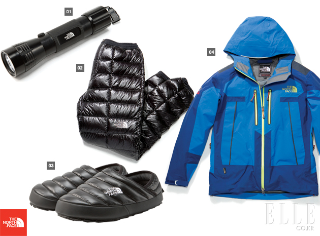 1 AAA 건전지 세 개가 들어가는 플래시 라이트. 2만4천원 2 고밀도 초경량의 소재를 사용한 구스 다운 팬츠. 21만원 3 실외용 보온화로 재생 고무 아웃솔과 페트병을 재생해 만든 원단으로 친환경적인 제품이다. 7만원 4 방수, 방풍, 경량성이 뛰어난 고어텍스 재킷. 77만원