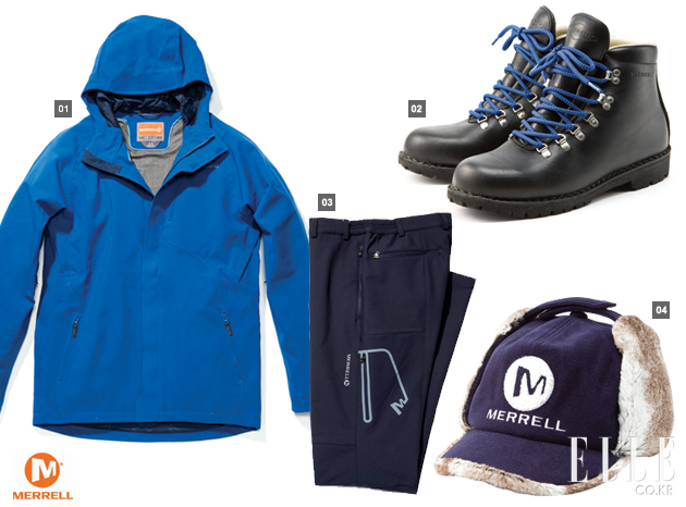 1 방수, 방풍, 투습 기능을 강조한 기능성 재킷. 23만원 2 스트리트 패션에도 잘 어울리는 블랙 레더 부츠. 51만9천원 3 발열 기능이 있고, 옆 라인에 웰딩 처리가 되어 착용감이 좋은 팬츠. 15만9천원 4 귀 덮개가 있어 보온성이 좋은 방수 소재 캡. 5만9천원