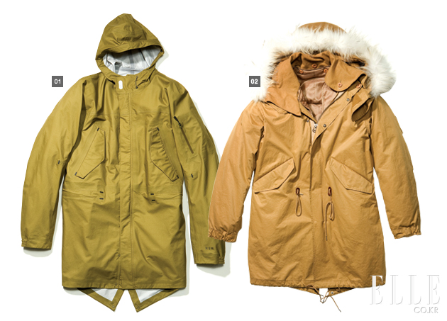 피시테일 파카(Fishtail Parka)라고도 불리는 M-51과 M-65. 51과 65는 상용화된 시기와 모델 넘버를 뜻한다. M-51은 후드가 몸 판과 붙어 있고 인조털 라이너를 사용했으며, M-65는 솜 라이너를 사용하고 후드 탈착이 가능하다는 차이가 있다. 보온 효과가 뛰어나며 넉넉한 품과 큰 소매통이 슬림함을 추구하는 요즘 트렌드와는 맞지 않지만 실루엣이 멋스러워 유행을 타지 않는 아이템으로 자리 잡았다. 디자인 포인트는 넉넉한 품과 털이 달린 후드 디테일이다. |