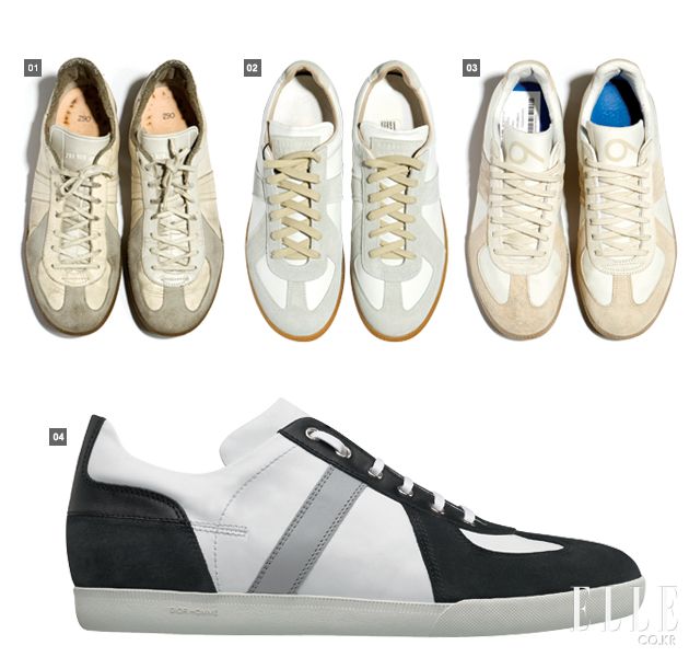 1 오리지널 독일군 스니커즈 BW스포트 2 독일군 레플리카 스니커즈 63만원 마틴 마르지엘라 3 레플리카 스니커즈 9만9천원 아디다스 오리지널스 4 변형된 스타일의 독일군 스니커즈 가격미정 디올 옴므