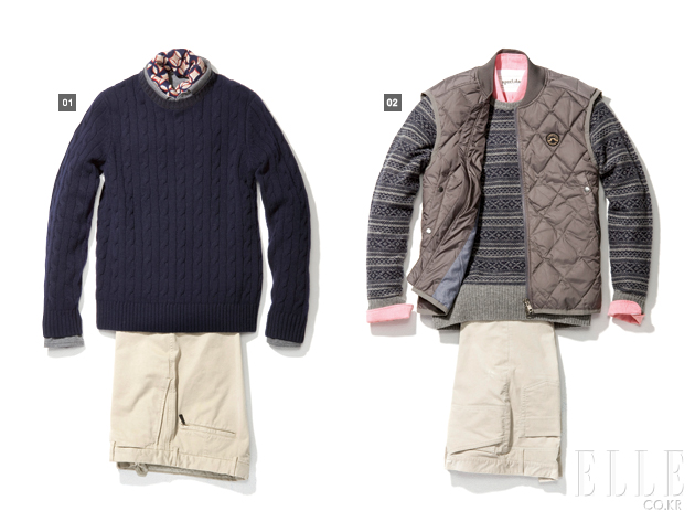 1 케이블 장식 니트와 치노 팬츠는 언제나 통하는 베이식! 스카프로 포인트를 주면 금상첨화. 그레이 폴로 셔츠 12만8천원, 니트 가격미정 모두 빈폴 패턴 스카프 가격미정 루이 비통 베이지 치노 팬츠 가격미정 에르메네질도 제냐