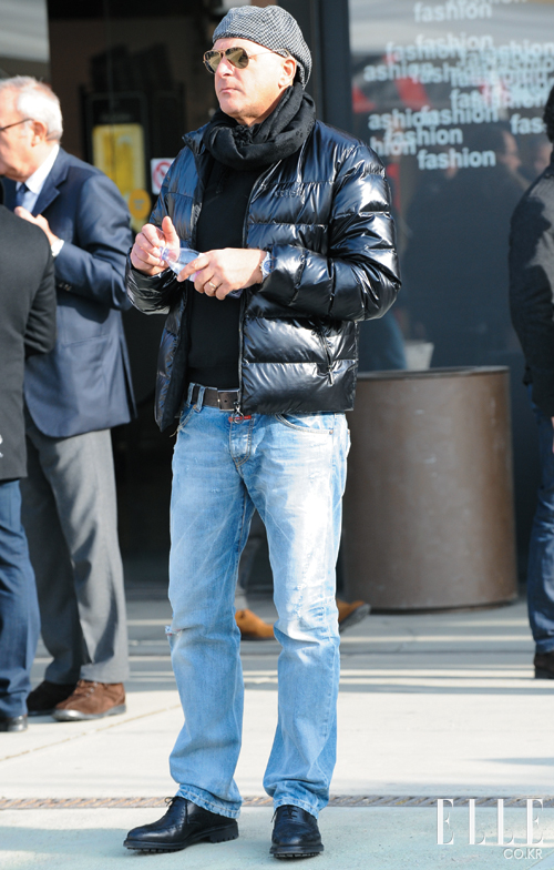 여름에나 어울리는 밝은 워싱 데님과 풍성한 블랙 패딩 점퍼는 전혀 조화롭지 않다. 헤링본이나 홈스펀 같은 잔잔한 패턴의 울 소재 팬츠를 택했다면 훨씬 세련된 룩을 완성할 수 있었을 것. |