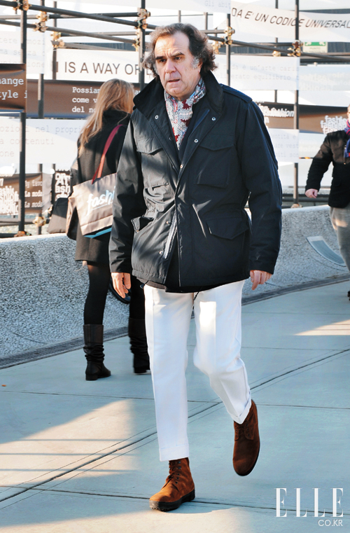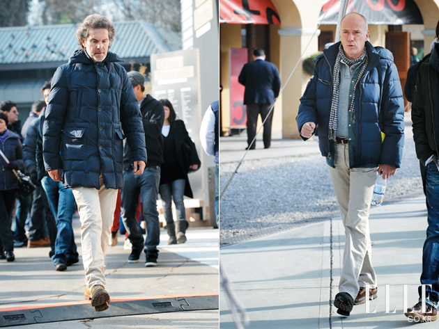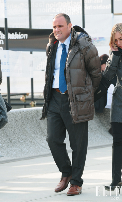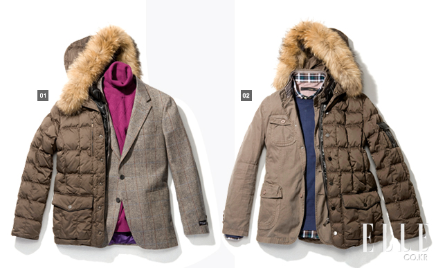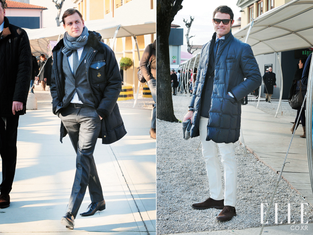오리털이나 거위털 같은 충전재가 들어 있어 부피감이 있는 패딩 아우터는 보통 캐주얼하게 연출하게 마련. 하지만 사진 속 남자들처럼 수트나 콤비 룩 위에 입어도 나쁘지 않다. 단 까다롭게 골라야 한다. 길이는 수트나 재킷을 덮을 정도는 되어야 한다. 그러니 블루종 형태의 패딩 점퍼는 일단 ‘아웃’이다. 컬러는 네이비나 브라운같이 얌전한 것으로, 패딩의 엠보싱은 크게 두드러지지 않는 것으로 고른다. |
