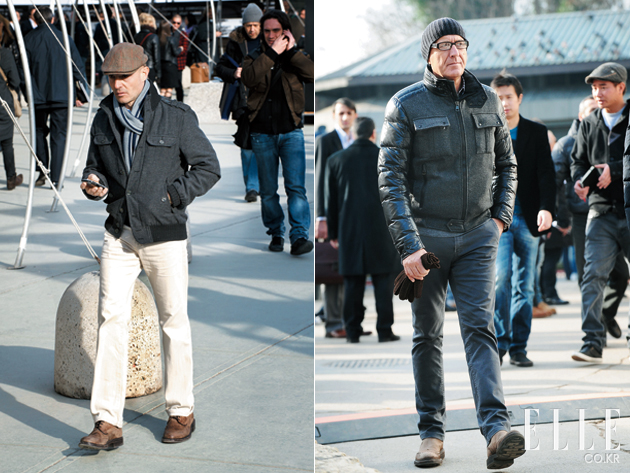 가죽 블루종도 멋지지만 더욱 실용적인 건 울 소재 블루종이다. 훨씬 가볍고, 포근하며 가죽에 비해 관리하기도 편하기 때문이다. 특히 이번 시즌엔 몸통과 팔 부분의 소재를 다르게 한 하이브리드 블루종이 눈에 띈다. 니트 비니를 쓴 사진 속의 신사처럼 심플한 면바지와 앵클부츠를 함께 매치하면 손쉽게 멋진 스타일을 완성할 수 있다. 또 다른 사진 속의 남자처럼 울 소재 헌팅캡을 활용하면 클래식한 영국 신사 느낌도 낼 수 있다. |