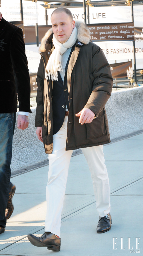 패딩 아우터를 포멀하게 소화하고 싶다면 수트의 피트부터 따져라. 사진 속 남자 같이 펑퍼짐한 수트 팬츠는 절대 금물이다. 잠이 덜 깨서 코트 대신 패딩 점퍼를 집어 들고 나선 것이 아닌가 의심스러운 옷차림. |