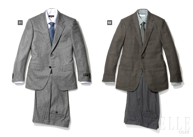 1 밝은 그레이 울 수트를 입는다. 어두운 컬러나 슬림한 라인의 수트는 코트와 더 잘 어울린다. 연보라 셔츠 가격미정 닥스 그레이 초크 스트라이프 수트 3백20만원, 바다색 울 타이 22만원 모두 꼬르넬리아니