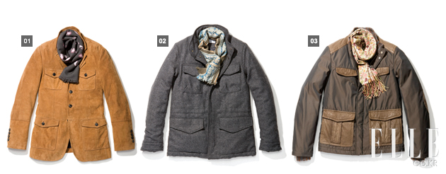1 스웨이드 소재 사파리 재킷은 캐주얼한 데님 팬츠와 잘 어울린다. 밝은 브라운 컬러의 스웨이드 사파리 재킷 1백48만원 빈폴 다크 브라운 바탕의 핑크색 페이즐리 패턴 머플러 29만원 프랑코 페라리 by 란스미어