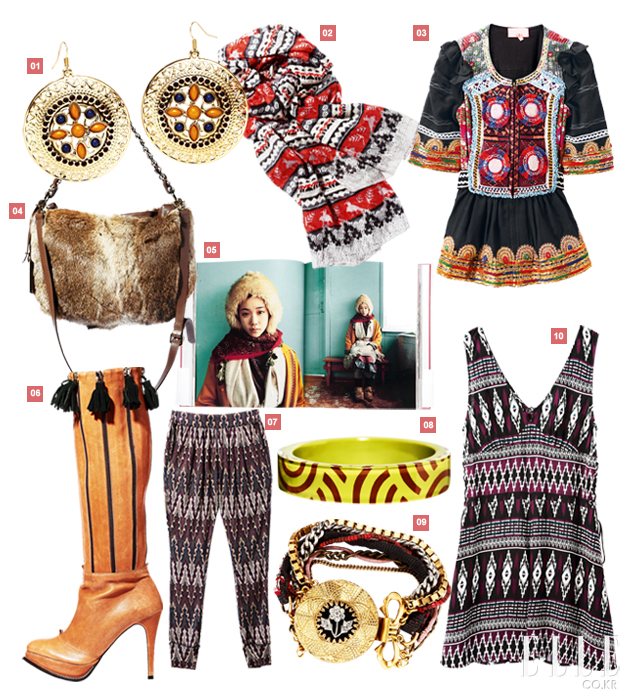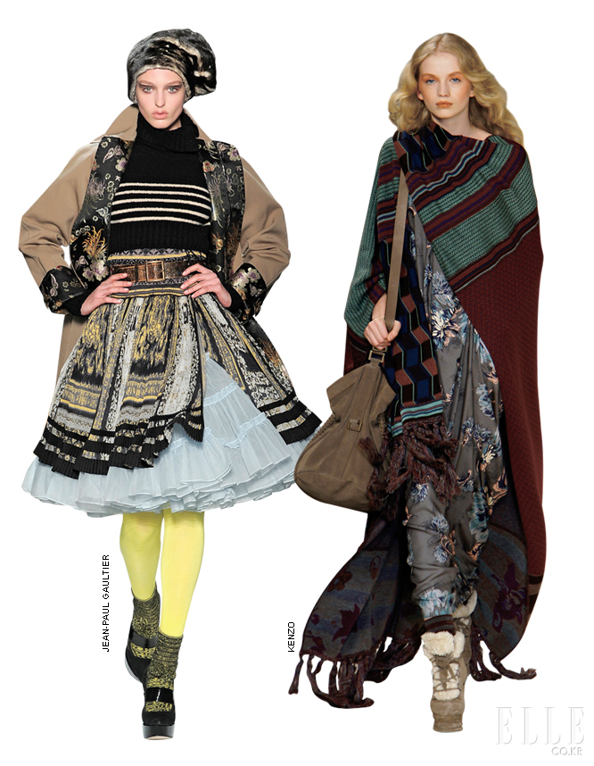 | 캣워크와 리얼웨이를 평정한 ‘클린 & 시크’의 종횡무진 속에서도, 현란한 패턴과 다채로운 컬러, 자유로운 레이어링이 주된 컨셉트인 에스닉 정신은 빛을 발하고 있다. 가히 동물적인 믹스 매치 감각이라고밖에 표현할 수 없는 본능적인 스타일링으로 일관된 ‘노매드(Nomad)’ 무드를 제안하며 이번 시즌 ‘보는 즐거움’을 선사한 컬렉션은 바로 장 폴 고티에. 민속적인 청삼에는 깅엄 재킷과 노르딕 싸이하이 싹스를 매치했으며, 청삼을 안감으로 댄 트렌치코트에는 마카롱 컬러의 샤 스커트를 더하고 스트라이프 톱을 입었다. 현대적인 패턴(스트라이프, 체크 등)은 에스닉 패턴과 기가 막히도록 잘 어울렸으며, 여기에 매스큘린한 수트와 트렌치코트를 더하니 드라마틱한 패션신이 완성됐다. 고티에가 블록버스터급 에스닉 무대를 선사했다면, 안토니오 마라스의 겐조는 좀 더 리얼 웨이에서 활용하기 쉬운 버전을 선보였다. 한 폭의 그림 같은 플로럴 드레스는 온몸을 감싸는 넓은 니트 숄이나 매니시한 테일러드 재킷, 풍성한 모피와의 매치로 한층 현실적인 에스닉 신이 연출된 것. 이처럼 이번 시즌 에스닉 무드는 다양한 패턴의 믹스 매치로 오버 스타일링을 완성하거나, 트렌치코트나 블레이저 재킷 등 클래식 아이템을 더해 룩의 균형을 완성하는 데에 있다. |