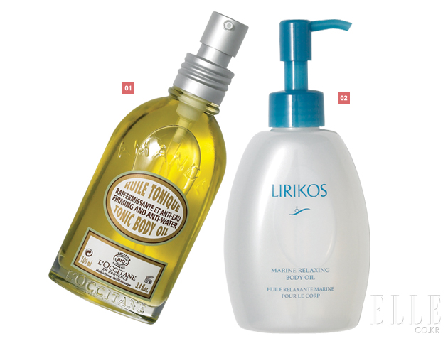 1 록시땅 아모드 토닉 바디 오일 58,000원 피부와 혈관 조직에 탄력을 주어 피부 탄력 개선은 물론 부종까지 예방하는 오일, 흡수가 빨라 끈적이지 않음, 100ml. 2 리리코스 마린 릴랙싱 바디 오일 40,000원 번들거림 없이 흡수되어 촉촉함만 남기는 오일, 습진으로 인한 가려움증을 개선함, 200ml.