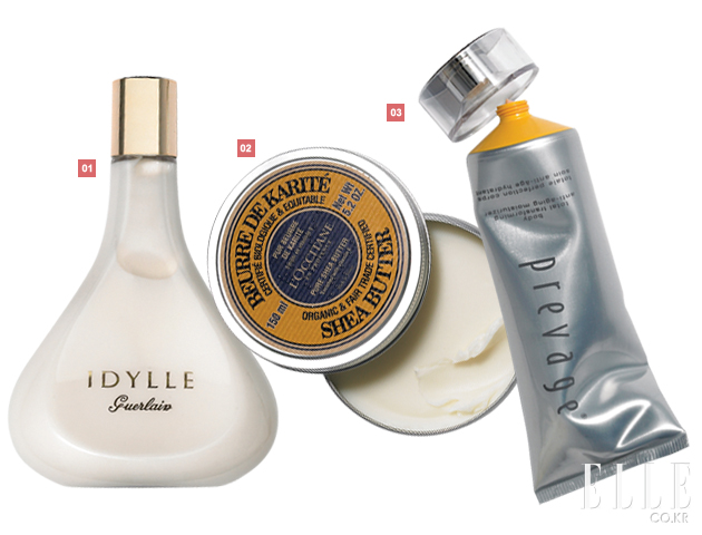 1 겔랑 이딜 보디 로션 73,000원 플로럴 시프레 향취를 남기는 퍼퓸 에멀전, 황금 진주 가루 함유, 200ml. 2 록시땅 퓨어 시어 버터 ESR 55,000원 모발과 입술, 보디, 페이스 어디든 사용해도 좋은 순한 포뮬러, 집중 영양 공급, 150ml. 3 엘리자베스 아덴 프리베이지 70,000원 건조하고 탄력 없는 피부는 물론 튼살, 임신선, 작은 흉터까지 동시에 관리해주는 보디 트리트먼트, 200ml. |