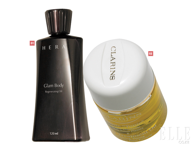 1 헤라 글램 보디 리제너레이팅 오일 40,000원 재생층과 보습층이 분리되어 더욱 깊은 보습 효과 및 재생 촉진 효과를 주는 보디 오일, 120ml. 2 클라란스 토닉 보디 트리트먼트 오일 57,000원 임신 중의 튼살이나 다이어트로 저하된 피부 탄력을 개선해 주는 오일, 샤워 후 젖은 몸 전체에 사용, 100ml.