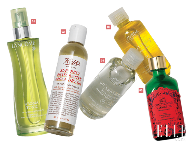 1 랑콤 아로마 토닉 보디 미스트 55,000원 심신이 상쾌해지는 아로마 테라피 효과, 이센셜 오일 23%이상 농축, 100ml. 2 키엘 수퍼블리 레스토라티브 드라이 오일 40,000원 얼굴, 보디, 모발에 윤기와 탄력을 주는 산뜻한 드라이 오일, 아르간 오일, 유기농 참깨씨 오일 등의 무방부제 성분, 125ml. 3 아베다 뷰티 파잉 컴포지션 32,000원 건성피부, 두피, 모발에 완벽한 보습과 영양을 주는 마사지 오일, 립과 아이 메이크업 클렌징에도 효과적, 50ml. 4 아베다 올 센스티브 바디 포뮬라 320,000원 얼굴, 바디 모두 사용할 수 있는 100% 유기농 호호바 오일, 카모마일 비사보올 성분이 피부를 진정시킴, 50ml. 5 로얄네이처 카밍클레이 퍼밍 오일 55,000원 건조하고 거친 피부에 유분과 수분을 공급해 매끄러움과 촉촉함이 남는 오일, 100ml. |