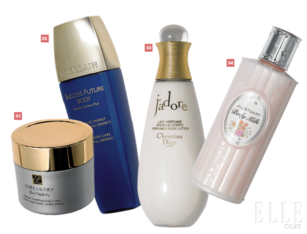 1 에스티 로더 리-뉴트리브 인텐시브 스무딩 보디 크림 200,000원 집중적인 보습 및 안티에이징 효능, 300ml. 2 겔랑 이딜 보디 로션 73,000원 플로럴 시프레 향취를 남기는 퍼퓸 에멀전, 황금 진주 가루 함유, 200ml. 3 크리스챤 디올 뷰티파잉 로션 69,000원 피부에 끈적임 없이 수분을 보충해주는 매혹적인 쟈도르 향취의 퍼퓸드 로션, 200ml. 4 질 스튜어트 보디 밀크 46,000원 피부를 끈적이지 않고 실크처럼 매끄럽게 가꿔주는 보디 밀크, 마돈나 릴리 추출물 함유, 250ml. |