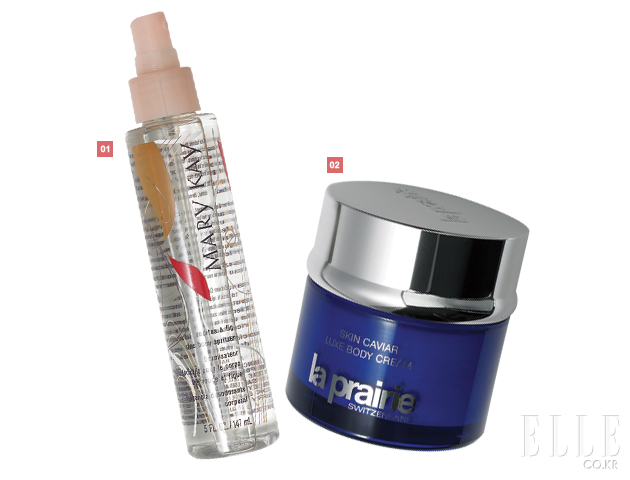 1 메리케이 보테니컬 보디케어 컬렉션 데오 보디 스프리처 25,000원 체취나 땀냄새를 억제하는 데오도란트 기능, 비타민 E와 연꽃, 시계풀 추출물 함유, 147ml. 2 라프레리 캐비아 럭스 보디 크림 499,000원 해조 단백질과 캐비아 추출물이 피부 탄력을 개선하고 영양을 공급하는 보디 크림, 150ml. |