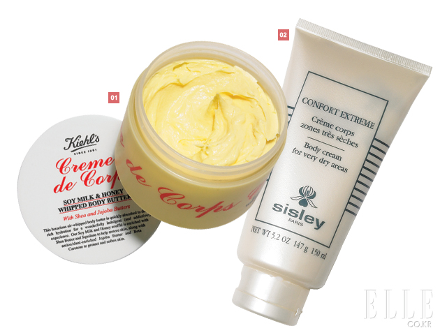 1 키엘 크렘 드 꼬르 보디 휘핑 크림 58,000원 휘핑 크림처럼 부드러운 텍스처가 24시간 마르지 않는 3중 보습 효과 발휘, 226ml. 2 시슬리 꽁뽀르 엑스뜨렘므 보디 크림 145,000원 각질과 땅김, 거친 피부결 등의 현상을 즉각적으로 개선, 수분 공금 및 유연화 작용, 150ml. |