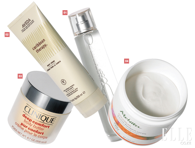 1 겐조키 퍼퓸드 베네피셜 워터 63,000원 센슈얼한 향취의 보디 스프레이, 쌀 추출물이 피부를 촉촉하게 해줌, 90ml. 2 아베다 캐리비안 테라피 보디 크림 45,000원 카리브 해 망고와 코코아 버터의 보습 작용, 달콤한 트로피컬 향취, 200ml. 3 크리니크 딥 컴포트 보디 버터 33,000원 히알루론산과 비타민 C, E가 풍부하게 함유된 고농축 보디 크림, 200ml. 4 멜비타 아피코스마 보디 밤 가격 미정 유분과 수분을 동시에 공급하는 천연 유기농 보디 크림, 시어 버터와 꿀, 카카오 버터 함유, 150ml. |