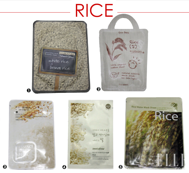 1 네이처리퍼블릭 프레시 화이트 시리얼 에센스 마스크 라이스 & 현미 (20ml, 쌀 추출물 0.004mg) 쌀과 현미 추출물이 함유된 농축 에센스 한병이 담겨진 마스크 시트. 피부에 닿는 시트의 감촉이 부드럽고, 밀착력이 뛰어나 유효성분을 효과적으로 전달해준다. 1천5백원, 네이처리퍼블릭. 2 더샘 에코백 마스크 시트 ‘투명한 쌀’ (25ml, 쌀 추출물 25,000ppm) 쌀 추출물이 함유되어 있어 칙칙하고 그늘진 피부를 맑고 깨끗하게 가꾸어 준다. 시트는 다소 도톰한 편이며, 100% 오가닉 순면 시트는 피부 밀착시 편안함을 준다. 1천5백원, 더샘. 3 아리따움 에센스 마스크 시트 ‘쌀’ (20ml, 쌀 추출물 20mg 함유) 쌀 추출물을 통해 피부의 칙칙함을 개선하여 피부를 맑고 환하게 가꾸어주는 시트 마스크. 단백질, 지방, 칼슘, 미네랄, 아미노산, 비타민이 함유되어 있다. 1천원, 아리따움. 4 이니스프리 네추럴 에센셜 마스크 ‘쌀’ (20ml, 쌀 추출물 20mg 함유) 쌀 특유의 성분이 풍부한 영양감과 브라이트닝 효과를 발휘하여 피부를 맑고 생기 있게 가꾸어준다. 시트가 다소 도톰하나 얼굴 전면에 빈틈없이 밀착되어 움직임에 제약이 없다. 9백50원, 이니스프리. 5 잇츠 스킨 라이스 워터 마스크 시트 (22g, 쌀겨 추출물 220mg) 천연 라이스 성분이 풍부하게 함유되어 촉촉한 보습감을 주며, 한층 밝아진 피부톤을 선사하는 마스크 시트. 1천5백원, 잇츠 스킨.