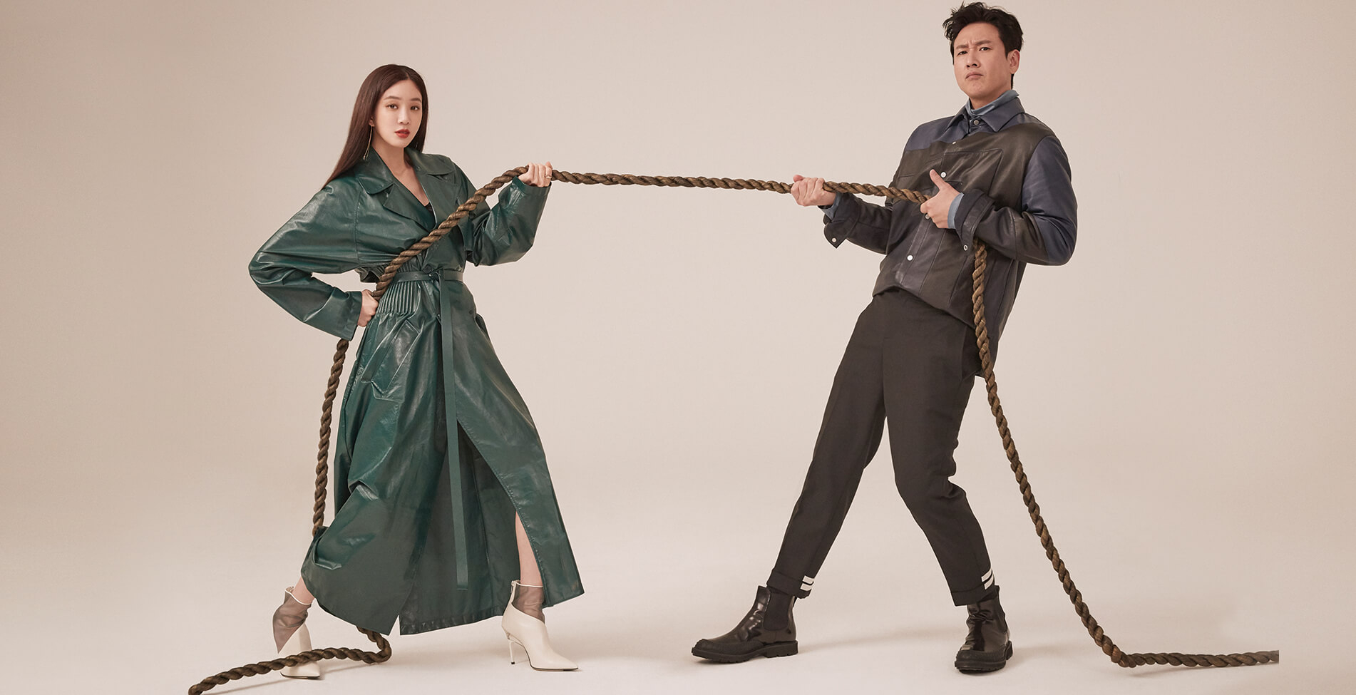 려원이 입은 그린 컬러의 레더 트렌치코트는 Bottega Veneta. 화이트 앵클부츠는 Jimmy Choo. 이선균이 입은 가죽 재킷과 이너 웨어는 Hermès. 바지는 Neil Barrett. 슈즈는 Tod’s.