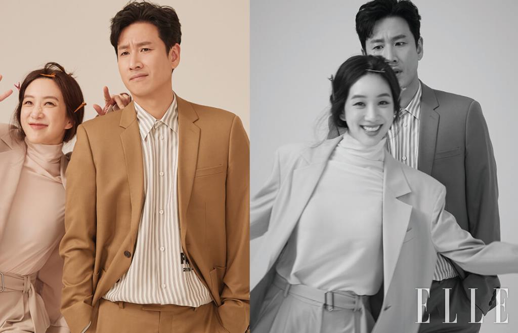 려원이 입은 그레이 울 수트는 Lemaire. 펌프스는 Sam Edelman. 이선균이 입은 그레이 코트는 Wooyoungmi. 블랙 수트는 Jill Stuart.