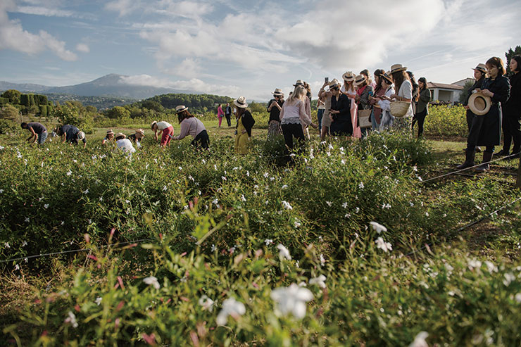 마농 농장에 피어 있던 자스민과 농장주 캐롤 비앙칼라나와 함께 자스민 수확을 체험하고 있는 각국의 프레스들.