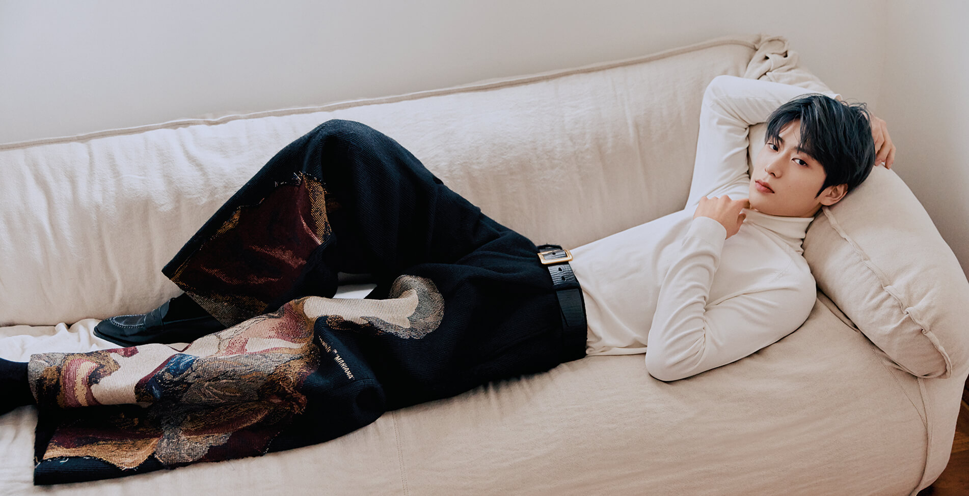 아이보리 컬러 터틀넥은 스타일리스트 소장품. 프린트 팬츠는 Off-White™. 로퍼는 Alden. 레이어드 반지는 Hustad.