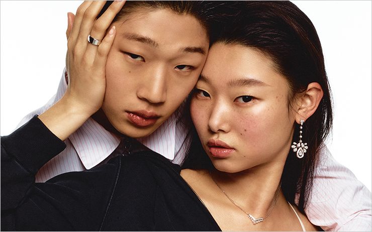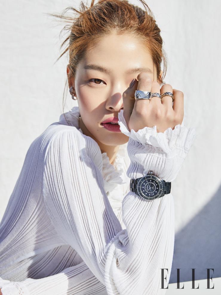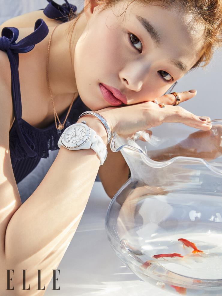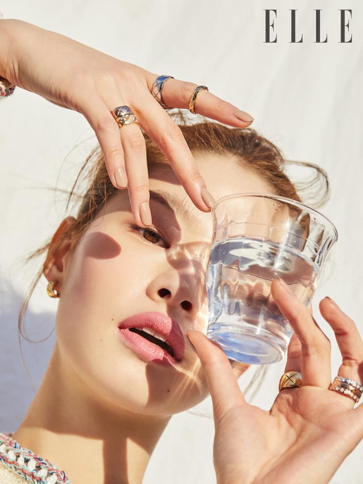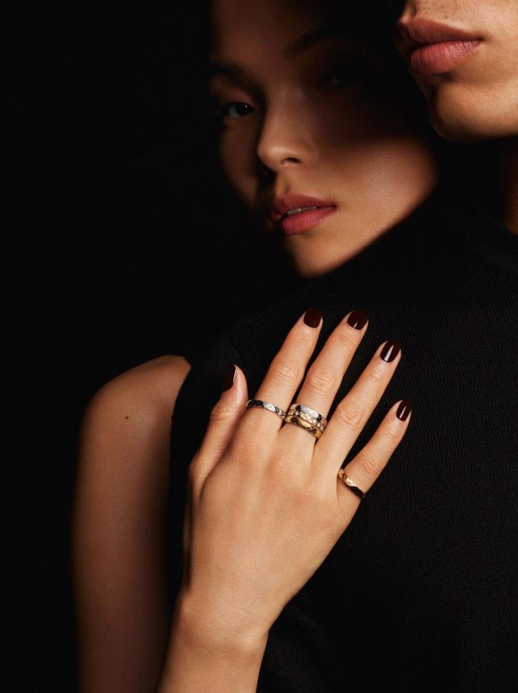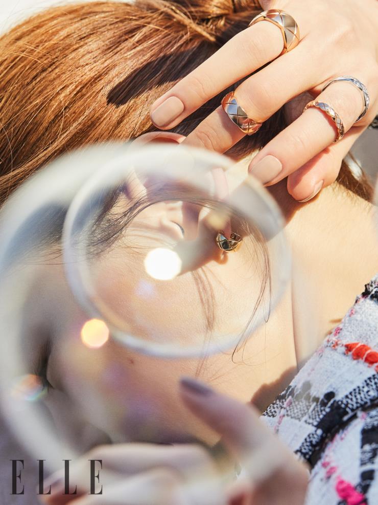 검지에 너클 링으로 연출한 옐로골드 코코 크러쉬 스몰 링과 18k 화이트골드와 옐로골드 링이 이어진 디자인의 코코 크러쉬 링, 다이아몬드 장식의 화이트골드 코코 크러쉬 브레이슬렛, 화이트 래커 다이얼과 화이트 세라믹이 조화를 이룬 J12워치, 베이지골드 코코 크러쉬 네크리스는 모두 Chanel Watches & Fine Jewelry.