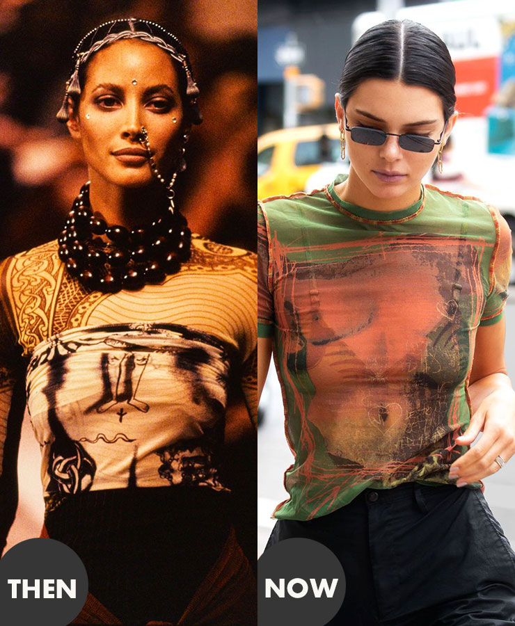 90년대 '프랑스 패션계의 앙팡테리블(악동)'로 불렸던 디자이너 장 폴 고티에. 1994년 S/S 컬렉션에서 당대 슈퍼모델이었던 크리스티 털링턴의 룩은 쇼의 컨셉이었던 동양의 신비주의와 잔 다르크의 정신을 반영했었답니다. 타투를 연상시키는 톱과 이국적인 액세서리가 돋보이죠? 지금 가장 핫한 모델이자 셀레브리티인 켄달 제너는 다양한 빈티지 장 폴 고티에를 컬렉팅하고 있는데요. <러브> 매거진 파티에서 포착된 켄달의 룩은 고티에의 빈티지 톱을 21세기 '갬성'으로 완벽하게 소화했다고 해도 과언이 아니에요. 블랙 레더 팬츠와 골드 체인 이어링, 유니크한 디자인의 블랙 선글라스까지! 톱이 돋보이도록 스타일의 강약을 주며 시크하게 마무리했네요.