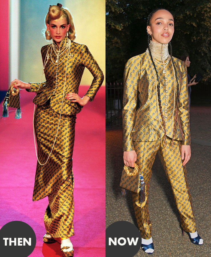 마리아 그라치아 치우리는 2020년의 디올을 위해 우아한 페미니즘의 숨결을 불어넣고 있는데요. 90년대, 2000년대 초만 해도 패션 팬들에게 디올은 궁극의 판타지 그 자체였답니다. 그 이유는 96년부터 디올을 이끌었던 디렉터였던 존 갈리아노 덕분이죠. 전위적이고 드라마틱하며 낭만적인 관점으로 디올 컬렉션을 한 편의 쇼처럼 연출했었어요. 뮤지션 FKA 트위그스는 런던 서펜타인 갤러리에서 열린 파티에 97년 F/W 컬렉션에서 커스티 흄이 입었던 디올 수트를 착용했습니다. 딥 골든 컬러에 플로럴 패턴의 수트는 섬세하게 장식된 진주 버튼이 특징인데요. FKA트위그스는 볼드한 진주 초커 액세서리를 더해 좀 더 쿨하게 연출했어요.