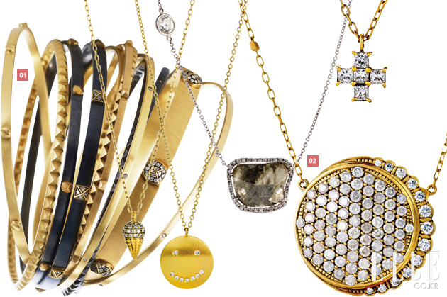 1 화이트 다이아몬드로 장식된 골드 뱅글은 수엘 제품. 2 아이스크림과 스마일 아이콘 등 독특한 펜던트가 달린 수엘의 네크리스들.