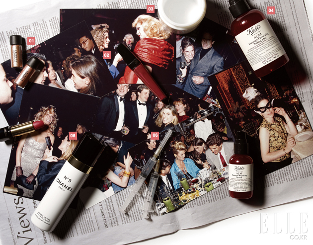 1 MAC 웜 쓰릴씨커스 피그먼트 글리터, 골드 모드. 5개, 6만원. 2 랑콤 압솔뤼 크렘드 브릴런스 립글로스. 3만8천원. 3 프레쉬 크렘 앙시엔느. 25만2천원. 4 키엘 아시이 데미지 프로텍팅 토닝 미스트. 4만5천원. 5 샤넬 NO.5 쉬어 모이스처 미스트. 5만5천원. 6 몇 십년 동안 나와 함께해 온, 이제는 두렵지 않은 주사기.