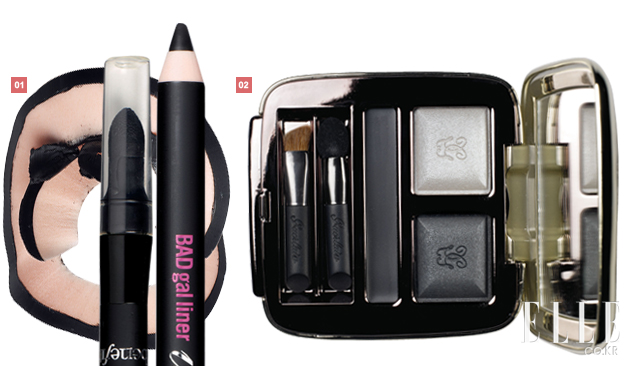 2 겔랑 옹브르 에끌라 듀오 & 라이너 383 뢰느 드 뉘. 6만3천원. 아이섀도와 아이라이너가 함께 있어 이 팔레트 하나면 스피디하게 스모키 아이 메이크업을 연출할 수 있다. TIP 그레이 컬러 아이섀도를 눈두덩에 베이스로 넓게 펴 발라 나중에 아이라이너가 번지는 것을 방지해준다. 실버 펄의 블랙 아이섀도로 라인을 그려준 후 실버 펄의 블랙 컬러로 포인트를 주면 끝. |