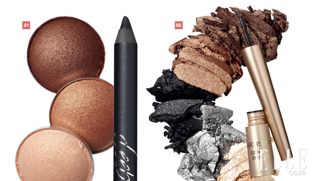 2 디올 5꿀뢰르 골드 에디션, 01 파이브 골드. 7만1천원 + 아티스트리 컨트롤 아이라이너, 블랙. 1만7천원. 펜슬에 능숙해졌다면 브러시 타입의 아이라이너로 야무지게 그려주고 골드와 블랙 아이섀도로 그러데이션한다. TIP 밝은 섀도를 눈 가장자리에 발라 눈을 크게 보이도록 하고 짙은 골드 컬러로 속눈썹 뿌리 부분에 바른 후 미디엄 브라운 컬러로 두 컬러를 이어주듯 블렌딩해준다. |
