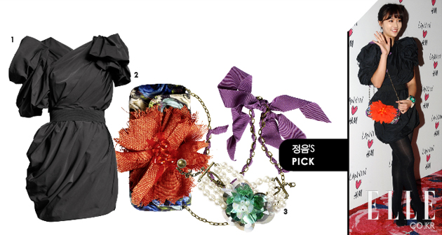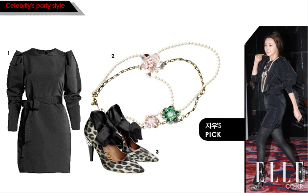 1 심심할 수 있는 블랙드레스에 반짝이는 소재와 리본 디테일로 포인트, 레그오브머튼 소매가 특징. 24만9천원, 랑방포에이치엔엠. 2 핑크와 그린 컬러의 플라워 모형과 체인이 어우러진 네크리스. 7만9천원, 랑방포에이치엔엠. 3 포인트 아이템으로 제격인 레오퍼드 스트랩슈즈, 뒷굽의 크리스털 디테일은 뒷모습을 더욱 아름답게 해줄 듯. 24만9천원, 랑방포에이치엔엠. |
