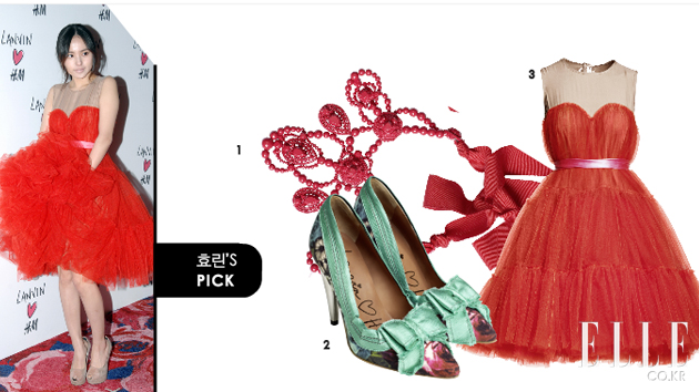 1 A라인 시폰 드레스. 블랙과 레드 두 가지 컬러. 29만9천원, 랑방포에이치엔엠. 2 핑크와 민트 컬러가 멋스럽게 어우러진 슈즈. 아웃라인부터 앞코까지 이어지는 리본이 앙증맞다. 24만9천원, 랑방포에이치엔엠. 3 팔각형과 물방울 모형이 서로 얽혀진 구조적인 네크리스. 6만9천원, 랑방포에이치엔엠. |
