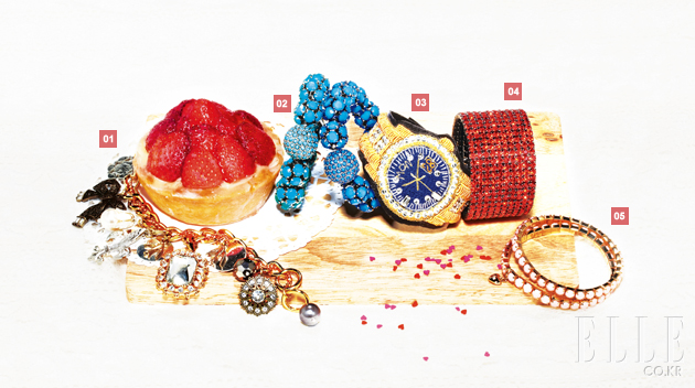 1 화려한 참 장식 브레이슬릿. 17만8천원. 탈리아. 2 비비드한 블루 볼 뱅글. 각각 7만5천원. 금은보화. 3 시계에서 모티브를 받은 비즈 뱅글. 19만원. 탈터반 베이런 동크 by 10 꼬르소 꼬모. 4 강렬한 레드 주얼 뱅글. 12만원. 엠쥬. 5 핑크 주얼 브레이슬릿. 3만9천원. 클루. |