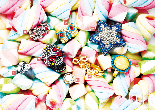 1 블랙 메탈 링. 10만원대. 봄 주얼리. 2 레드 주얼리 링. 8만9천원. 스와치 비쥬. 3 키치한 디자인의 해골 링. 4만9천원. 롤립스. 4 부엉이 모티브 링. 3만8천원. 햄쿤. 5 동심원 모양의 주얼 링. 10만원대. 봄 주얼리. 6 두 손가락에 끼는 러브 링. 1만9천원. 액세서라이즈. 7 별 모양 주얼 링. 4만8천원. 햄쿤. 8 플라워를 연상케 하는 블루 링. 10만원대. 봄 주얼리. |