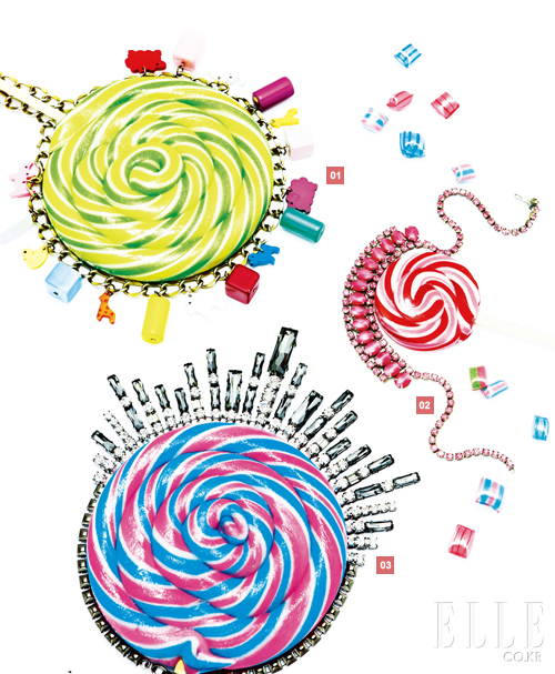 1 알록달록한 애니멀 참과 토이 참이 유니크한 네크리스. 6만8천원. 엠쥬. 2 룩에 화려하게 포인트를 줄 수 있는 핑크 주얼리 네크리스. 가격 미정. 제이미 앤 벨. 3 청키한 보석이 돋보이는 네크리스. 가격 미정. 벨 앤 누보. |