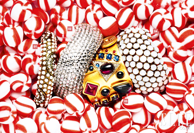 1 작은 진주로 빈티지한 멋을 강조한 뱅글. 2만9천원. 액세서라이즈. 2 파티 룩에 제격인 화려한 크리스털 뱅글. 6만9천원. 블랙뮤즈. 3 다양한 형태의 주얼 장식으로 꾸며진 골드 메탈 뱅글. 가격 미정. 쥬시 꾸뛰르. 4 주얼 장식이 촘촘히 장식된 볼드한 뱅글. 6만6천4백원. 수빈 주얼리. |