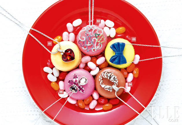 1 볼드한 하트 펜던트 네크리스. 16만5천원. 스와로브스키. 2 컬러풀한 주얼리 펜던트 네크리스. 47만9천원. 제이 에스티나. 3 사랑스러운 레더 리본 네크리스. 6만4천원. 아가타. 4 크리스마스트리 오너먼트 네크리스. 가격 미정. E.S 돈나. 5 바이올렛 크리스털 펜던트 네크리스. 18만5천원. 스와로브스키. |