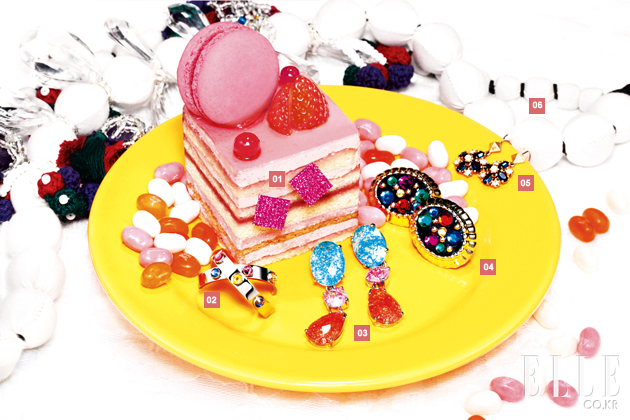 1 핑크 크리스털 큐브 이어링. 2만5천원. 엠쥬. 2 컬러풀한 스틸 소재 주얼 이어링. 5만원대. 스와치 비쥬. 3 아이스 캔디 컬러의 원석 이어링. 12만원. 엠쥬. 4 알록달록 빈티지한 컬러 이어링. 가격 미정. 제이미 앤 벨. 5 큐트한 십자가 주얼 이어링. 가격 미정. 쥬시 꾸뛰르. 6 패브릭과 크리스털이 믹스된 구슬 네크리스. 가격 미정. 데이미켈슨. |