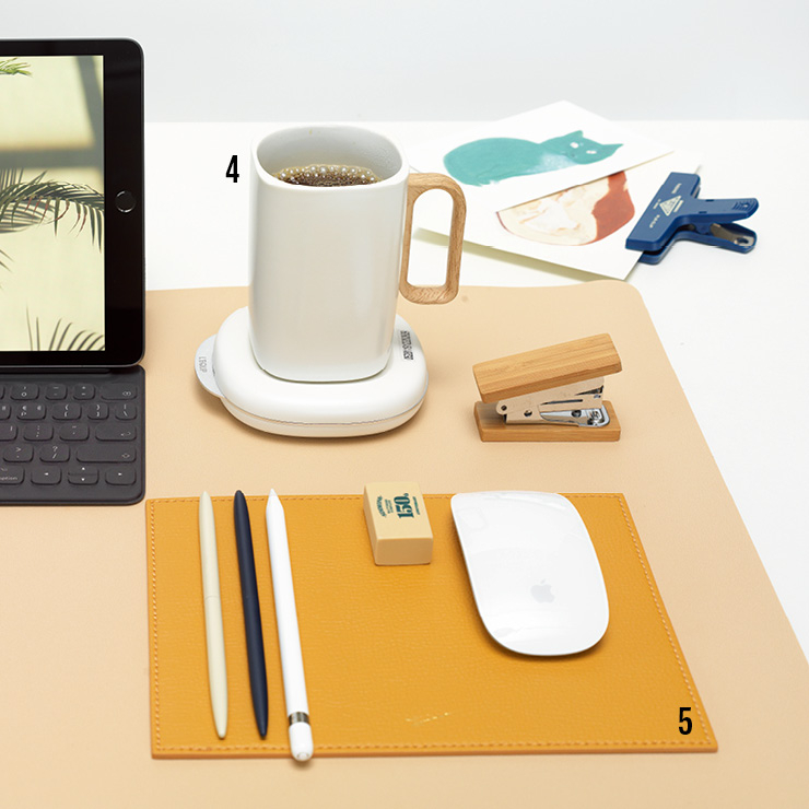 5 마우스 패드의 생동감 있는 컬러가 집중 근무에 힘을 불어넣는다. 노란색 말고도 올리브, 와인 등 고를 수 있는 색상이 다섯 가지나 더 있다. 17×23cm, 2만9천원, Fibreno.