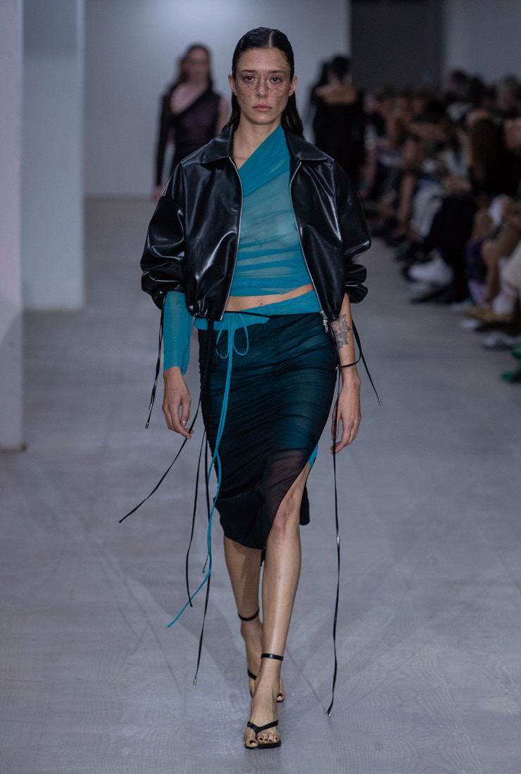 여성스러운 디테일이 많이 보인다 속이 비치는 시어한 원단과 드레이핑 같은 디테일은 인도 전통 의상 사리를 재해석하면서 탄생했다. 컬렉션에는 이런 연약한 요소와 단단한 소재를 함께 사용했다. 시각적 대비를 통해 여성성과 현대성을 함께 묘사하고 싶었다.