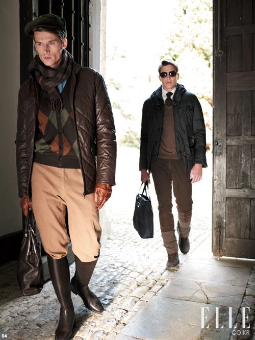 4 (왼쪽) 다크 그린 헌팅캡, 니트 머플러, 데님 셔츠, 아가일 패턴 브라운 카디건, 퀄팅 레더 재킷, 팬츠, 장갑, 토트백 모두 닥스
