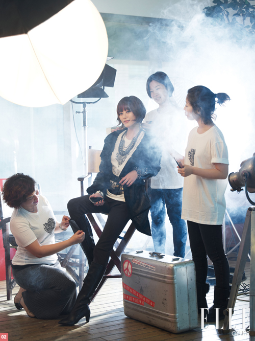 | 2 김효진과 스태프들이 함께 입은 하트 포 아이 티셔츠, 김표진의 재킷과 팬츠는 모두 Kuho. |