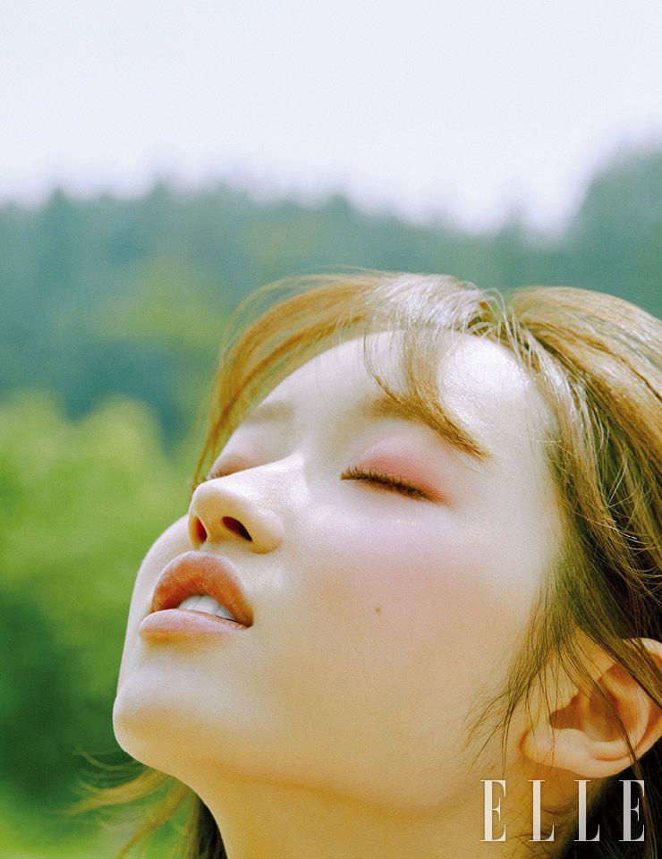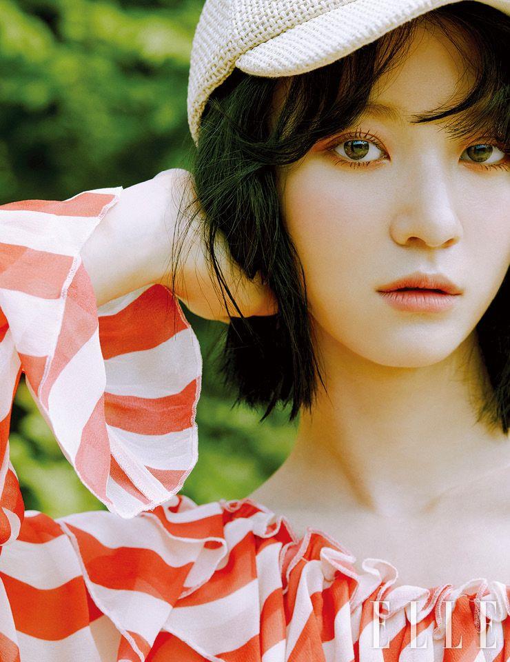 효정의 슬리브리스 톱과 쇼트 팬츠는 모두 Nancyboo. 목걸이는 Kanco x Fruta. 승희가 입은 레이스 칼라의 그린 원피스는 Miu Miu. 플랫폼 슈즈는 Dr. Martens. 삭스는 스타일리스트 소장품. 포크파이 햇은 Hatstory.