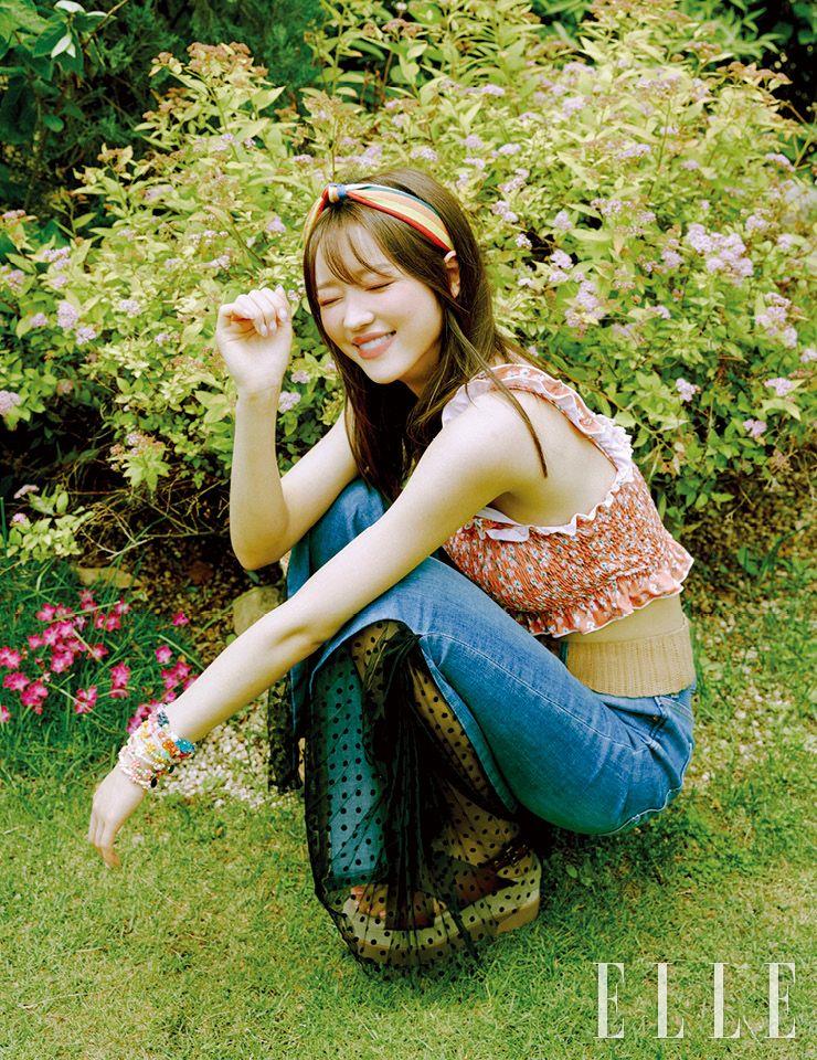 지호의 플로럴 프린트 톱은 Claudie Pierlot. 데님 팬츠는 Miu Miu. 유아가 입은 플라워 패턴의 스모킹 브라톱은 스타일리스트 소장품. 망사 디테일의 데님 팬츠는 Lang & Lu. 크로셰 니트 벨트는 MSGM. 미미의 퍼플 컬러 티셔츠는 Acne Studios. 데님 베스트는 Stella McCartney. 턴업 커프 진은 Loewe.
